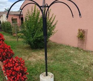 SUSPENSION EN FER Forme Parapluie Pour suspendre 6 pots de fleurs Pied fixé dans socle en béton (assez lourd) Dimensions : Socle hors sol 25 cm et 32 cm de diamètre Tige