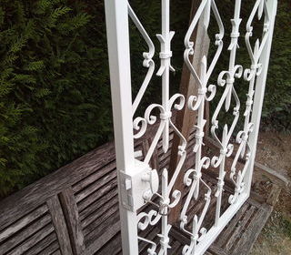 Portillon en métal de construction ferronnerie. Avec décoration de volutes, de pointes fer de lance, de bagues... Dimensions hauteur 134 cm x largeur 97,5 cm x largeur tota