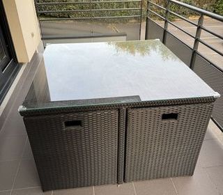 Je vends un salon de jardin 4 places en résine tressée comprenant : - Une table avec plateau en verre - Plusieurs assises confortables avec coussins - Une housse de protection i