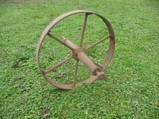 Vends roue métallique ancienne de brouette - diamètre 45,5 cm environ - largeur bande de roulement 4,5 cm environ - longueur moyeu 37,5 cm -
