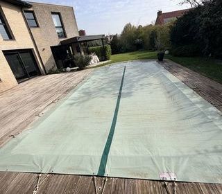Baches hiver pour Piscine avec sangles. Couvre une piscine 4 par 8 style Desjoyaux avec escalier roman. À retirer sur place.