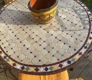véritable table artisanale en Zellij importée du Maroc et 5 chaises en fer forgé. valeur 1000 € vendue 500 €