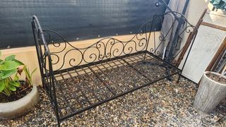 À vendre, portail en fer de couleur blanche, composé de deux battants. Dimensions standard. Équipé de motifs décoratifs en haut de chaque battant et d'une serrure avec poignée. Bon