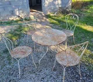 salon de jardin fer forgé ancien Année 40.50 en bonne état mais à repeindre une table 4 chaises 300 euros
