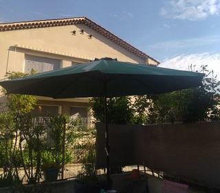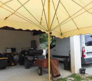 PARASOL BLANC TAILLE 4X3 MËTRES ETA NEUF ASSALIT BOUC BEL AIR HAUTEUR FERMEE 2.80 POIDS 18 KGS + PENDERIE COMPLETE 2 PIEDS TRIPODE + ACCESSOIRES PARASOL ORANGE 2X3
