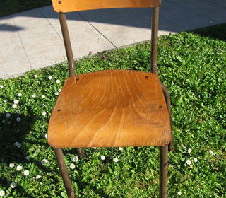 25 chaises d'école vintage, armature en tube, dossier et assise en bois vernis.