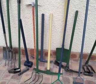 OUTILS à MAIN DIVERS de JARDINAGE - PELLES (Carré-Plate tassement superficiel de la terre) - PIOCHES - BÊCHE - FOURCHE HERBE-FOIN-FUMIER (large, professionnelle-agriculteur) - GRI