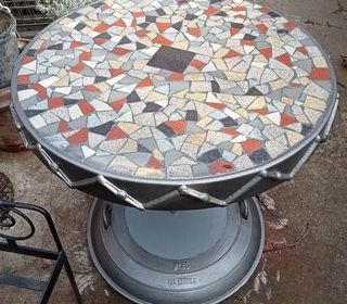 Table en Béton plateau 80cm fait avec une ancienne roue de charrette et carrelage mosaïque dessus, hauteur 74cm, pied fait avec un ancien couvercle.