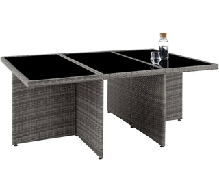salon jardin 12 personnes avec fauteuils et tabourets encastrables dans fauteuils couleur gris crème table 1, 80cm avec verre fumé ,et housse de protection