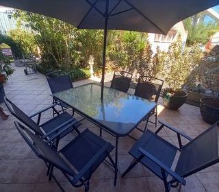 salon de jardin complet neuf comprenant une table , six chaises pliantes avec très beau parasol