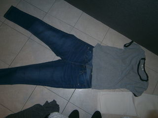 - un jean bleu + T shirt gris - un short jean bleu + T Shirt rose orangé imprimé - un jean blanc + débardeur sport noir 5 euro l'ensemble bas + haut 12 euros le tout