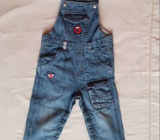 Vends une salopette en jean, boutons pressions aux bretelles, sur les côtés et aux entrejambes, marque Orchestra, taille 23 mois.