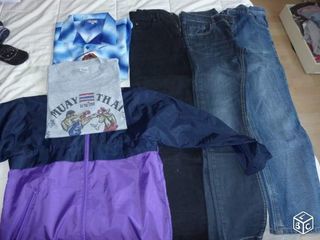 3 jeans : 1slim et 2 droits 1 chemise manche courte 1tee shirt mcourtes (vendu) 1 kway bleu et violet TBE 12ans