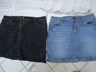Lot de 6 minies-jupes T36-38 -2 jupes jean bleues tour de ceinture 76cm hauteur 38cm -1 blanche à volants (Camaieu) tour ceinture 76, hauteur 40cm -1 bleue en elastan (Angelie)