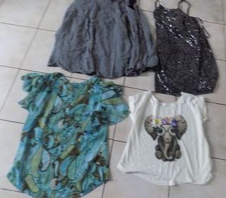 lot de 9 vêtements comprenant 1 jupe grise, 1 robe noire pailletée, 1 haut vert transparent, 1 tee-shirt court avec un éléphant à lunettes, 1 pull rose écrit pretty, 1 pull gris ra
