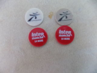 lot de 4 jetons publicitaire 'intermarché' pour caddies 1 blanc, 1 marron et 2 rouge en plastique
