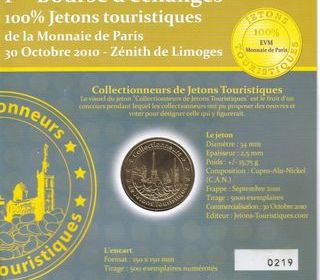 Encart commémorant la 1ère Bourse d'échange 100% jeton touristiques de la Monnaie de Paris qui a eu lieu le 30 octobre 2010 au Zénith de Limoges. Limité à 500 exemplaires seulem