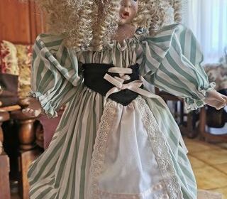 Cette poupée de collection mesure 36 cm. Elle tient debout. Son prix est de 5 €. C'est un prix cadeau car je veux vider mon appartement. La poupée pèse 500 g emballée dans la b