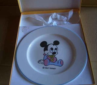 Assiette au décor de bébé Mickey de Disney dans sa boite de cadeau de naissance de la marque "COUZON" Porcelaine de chez APILCO France. Pouvant servir pour les repas de votre enfa