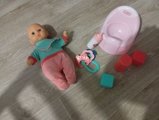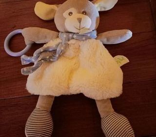 Doudou lapin blanc plat avec écharpe bleu et petits pois avec anneau de Baby Nat'. Fait bruit grelot et écharpe bruit " sachet ". Neuf, jamais servi.