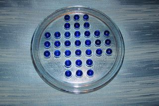 Jeu de solitaire en verre Plateau en verre granité avec 33 billes en verre Diamètre du plateau : 24,5 cm Etat neuf A venir chercher sur place Règlement en espèces pas