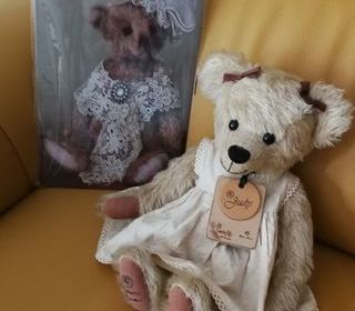 Prénommée "Judy" par la créatrice N0 347/500 Fait main Collection personnelle En très bon état La robe en lin se ferme par 2 scratch (a besoin d'un nettoyage) Taille 35 cm M