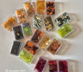 Des sequins en quantités de couleurs différentes et de toutes les formes 20 formes et couleurs différentes, les paillettes sont toutes percées Dimensions les sequins