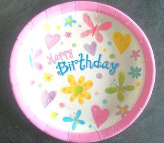 Accessoires neufs pour anniversaire de fille, jamais servis. Comprenant 7 assiettes plates, 11 serviettes légèrement froissées, 9 verres + 1 boite de 8 bougies déjà allumées quelq