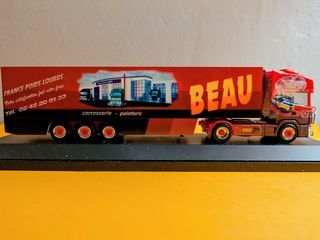 AUTOTRANSPORTER très beau Camion porte voitures en bois de qualité avec 4 voitures en bois Longueur 38cm surface de chargement basculante fait en Allemagne conforme aux norm