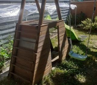 Portique pour enfants de 3 à 10 ans avec toboggan de grande taille et tapis de réception en caoutchouc souple, 2 balançoires suivant l'âge, sous la passerelle pour accéder au tobog