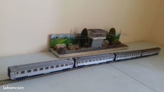 Rame de 4 voitures voyageurs inox (type Mistral) de la marque LIMA en HO . La voiture de queue est éclairée en feu de fin de convoi (2 LEDS rouge) . Voitures équipées de souffl