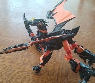 En très bon état avec lance missile et une hache,le haut du crâne s'allume,se transforme en robot les ailes ne sont pas cassées. Dimensions 25x30x11 à partir de 6 ans