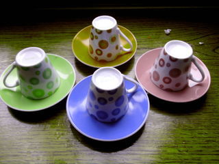 Dinette service à café 4 personnes un service coloré vert rose bleu orangé sous tasse diamètre 11 cm et tasse 5.5 haut diamètre 5.5 environ deux services en bleu sous ta