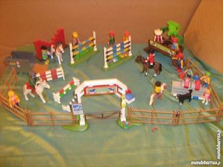 PLAYMOBIL COMPLEMENT N° 2 POUR CENTRE EQUESTRE AVEC PARCOURS DE SAUT D'OBSTACLES AMELIORE avec 15 PERSONNAGES 3 chevaux , 1 poney , 1 chien , cravache , fouet ,