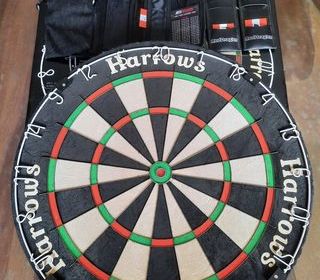 Jeu de fléchettes Harrows avec cible et fléchettes. Inclut une cible en feutre, trois ensembles de fléchettes Red Dragon, et pochettes pour rangement des accessoires. Parfait pour