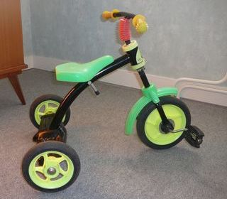 Tricycle unisexe vert/jaune pour enfant de 2 à 5 ans, marque Italtrike avec garde boue avant, assise et intérieurs de roues en PVC. Le cadre et le guidon sont en acier coloris noir