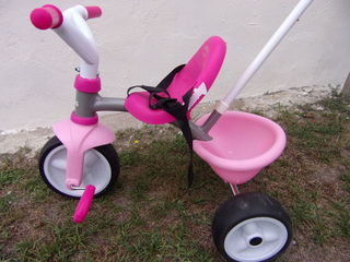 Marque SMOBY couleur cerise . Fabriqué en Europe . Equipement : canne parentale avec large poignée . Pédales antidérapante. roue avant débrayable petite benne basculante / H