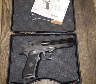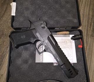 Pistolet à tir à blanc basé sur le pistolet légendaire en cal.50 AE.Apparence impressionnante grâce au canon allongé et au compensateurGlissière brunie avec fond en acier allongéRa
