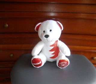 Ourson assis de la marque originale Nocibé Hauteur 20 cm, Largeur 17 cm, Profondeur : 16 cm, 100 % polyester, Incrustation imitation cuir sur le corps, Oreilles et pieds en