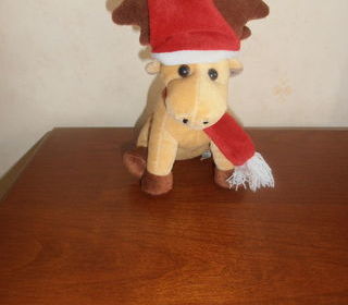 Très jolie peluche, cerf de Noël agrémenté d'un bonnet et d'une écharpe en velours rouge. Il peut aussi être suspendu grâce à un petit ruban assorti. Hauteur : 18 cm. Excelle