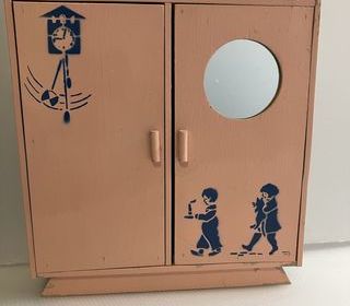 Ancienne armoire de poupée en bois Année 1930 Décor au pochoir Très bon état Hauteur 370 mm Largeur 325 mm Profondeur 95 mm
