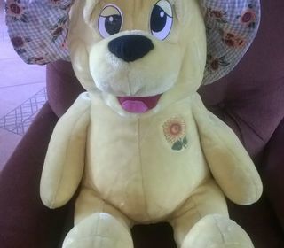 PELUCHE OURS JAUNE DE 55 CM de hauteur - en position assise EN BON ETAT avec chapeau