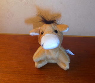 Très jolie peluche de couleur marron clair avec crinière noire, la base est lestée pour rester assis, peluche toute douce. Dimensions : 9 cm x 6 cm x 5 cm. Excellent état ca