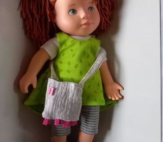 Poupée Milou, marque HABA (305585). Corps mou en tissu. Tete,bras et jambes en vinyle . Cheveux en laine. Yeux peints. la poupée peut entierement se déshabiller. Hauteur 32 cm.