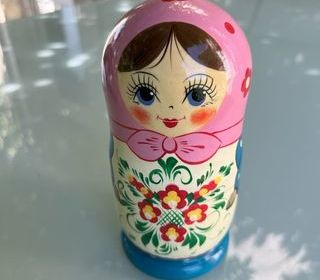 Matriochka traditionnelle à 5 poupées Hauteur : La plus grande poupée mesure 18 cm Design : Foulard rose élégant, écoré avec des fleurs Matériau : Fabriquée en bois de tilleul,