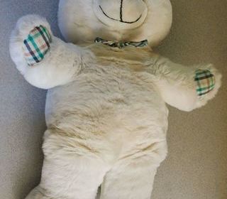 Grand/géant ours en peluche de la marque française Gipsy (Grand Prix du Jouet 2018-section peluche, licences Coupe du Monde de Rugby 2023, Jeux Olympiques Paris 2024). Empreintes a