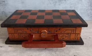 Coffret artisanal en bois de 32 pièces d'échecs Artisanat Amérique Latine Taille du coffret fermé : 25 cm X 15 cm X 7,5 cm Taille d'un roi : 7 cm Taille d'un pion 4 cm