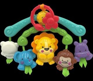 dès la naissance - mobile nomade - s'attache facilement à la poussette - 2 bras tournent indépendamment l'un de l'autre - 4 personnages suspendus - doux rubans divertissent bé