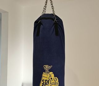 Sac de frappe en tissu, bleu, marque SDI. Pas de trou, jamais eu besoin de le réparer, bon état. Anneau avec 4 chaînes pour fixation au plafond ou sur un support. (la fixation