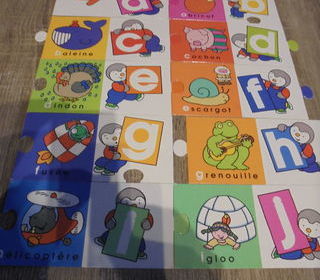 Puzzle abécédaire, soit les 26 lettres de l'alphabet, chaque pièce représent Tchoupi avec la lettre concernée et une illustration commençant par la lettre précédent ce qui permet